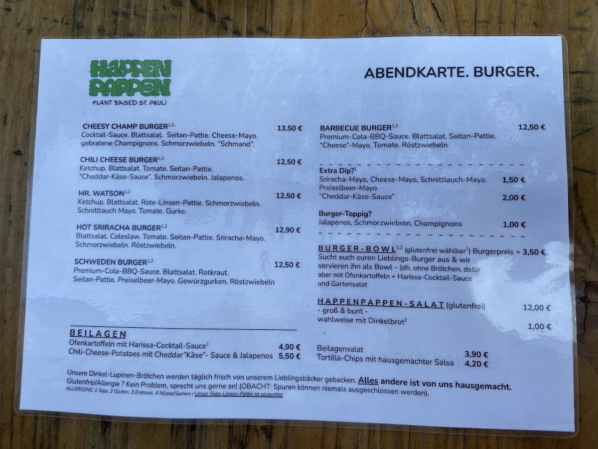 Welcome to HAPPENPAPPEN, a delightful gem nestled in the heart of Hamburg at Feldstraße 36. This cozy venue specializes in plant-based cuisine, captivating both vegans and vegetarians alike. The vibrant atmosphere and friendly staff create an inviting experience, though it’s wise to arrive early, as the spot quickly fills up with food enthusiasts.